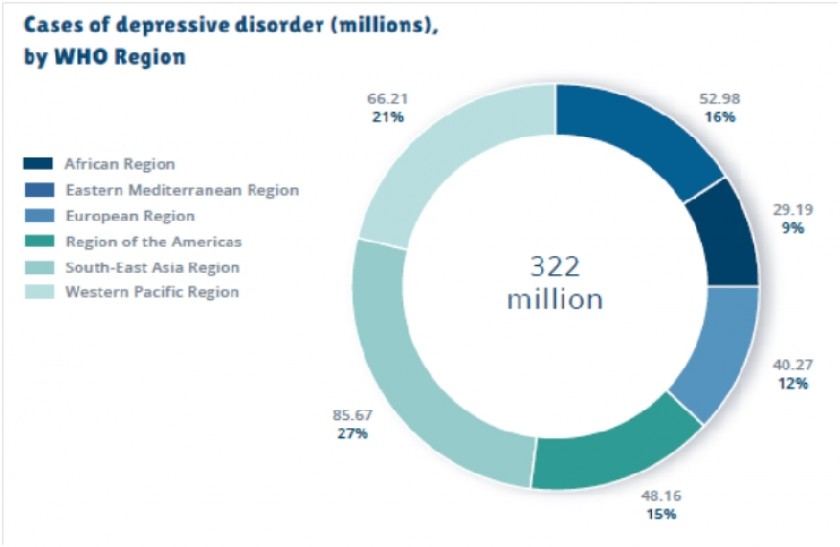 แผนภูมิแสดงสัดส่วนการเกิดโรคซึมเศร้าในกลุ่มประชากรแบ่งเป็นหกภูมิภาคทั่วโลก รายงานโดย WHO ปี ค.ศ. 2017 ที่มา: Depression and Other Common Mental Disorders Global Health Estimates, World Health Organization 2017