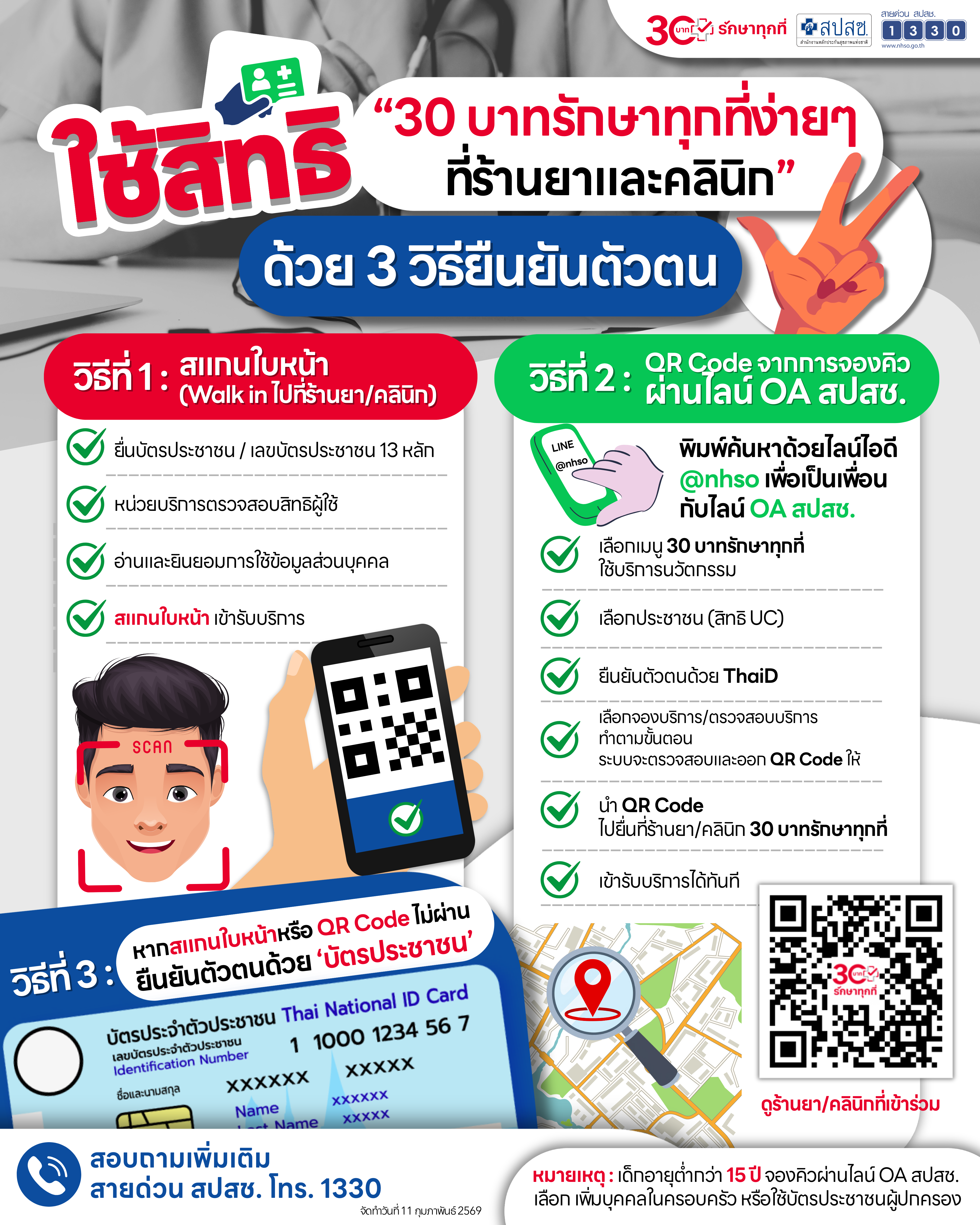 วิธีที่ 2 QR Code จากการจองคิวผ่านไลน์ OA สปสช. (ไลน์ไอดี @nhso) ให้พิมพ์ค้นหาด้วยไลน์ไอดี @nhso เพื่อเป็นเพื่อนกับไลน์ OA สปสช. เลือกเมนู “30 บาทรักษาทุกที่” ใช้บริการนวัตกรรม เข้าสู่บริการสำหรับประชาชนสิทธิ UC ยืนยันตัวตนด้วย ThaiD เลือกจองบริการ/ตรวจสอบบริการ จากนั้นทำตามขั้นตอน ระบบจะตรวจสอบพร้อมออก QR Code ให้ และให้นำ QR Code ไปยื่นที่ร้านยา/คลินิก 30 บาทรักษาทุกที่ เข้ารับบริการได้ทันที และ วิธีที่ 3 หากสแกนใบหน้าหรือ QR Code ไม่ผ่าน ให้ยืนยันตัวตนด้วย ‘บัตรประชาชน’ เข้ารับบริการได้ตามสิทธิ