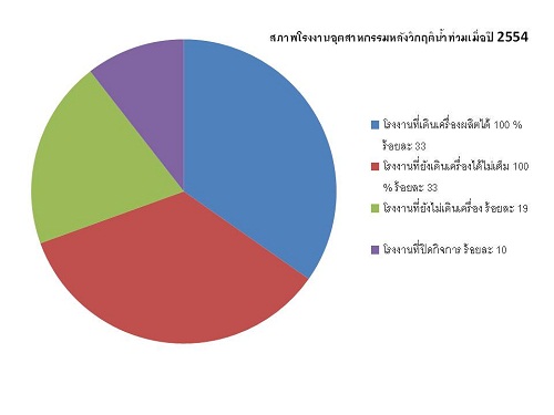 จากการลงพื้นที่ของสภาอุตสาหกรรมแห่งประเทศไทย เมื่อเดือนพฤษภาคมที่ผ่านมาพบว่า โรงงานที่สามารถเดินเครื่องจักรในการผลิตได้ 100 เปอร์เซ็นต์ มีประมาณ 33 เปอร์เซ็นต์ โรงงานที่ยังเดินเครื่องได้ไม่เต็ม 100 เปอร์เซ็นต์ จำนวน 33 เปอร์เซ็นต์ และอีก 19 เปอร์เซ็นต์ ยังไม่มีการเดินเครื่อง ในขณะที่ 10 เปอร์เซ็นต์ ปิดโรงงาน ซึ่งมีทั้งย้ายฐานการผลิตไปที่อื่น หรือเลิกกิจการเพราะน้ำท่วม รวมถึงโรงงานที่คิดจะเลิกกิจการอยู่แล้วด้วย
