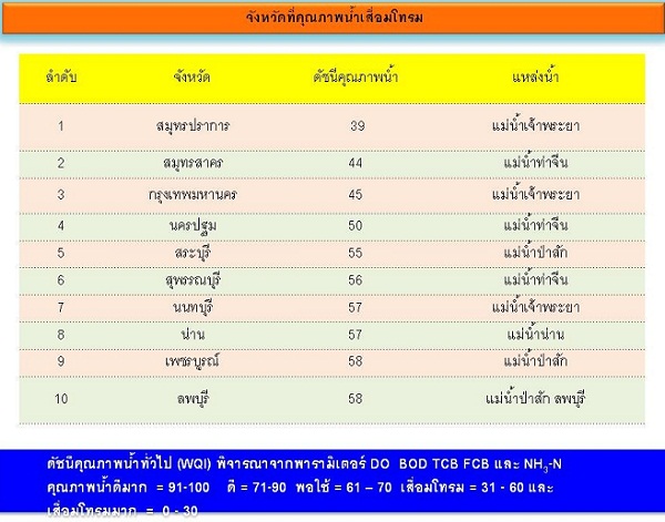 พื้นที่ที่ต้องแก้ไขปัญหาคุณภาพน้ำโดยเร่งด่วน ได้แก่ แม่น้ำเจ้าพระยา สมุทรปราการ นนทบุรี แม่น้ำท่าจีน สมุทรสาคร นครปฐม แม่น้ำป่าสัก สระบุรี เป็นต้น