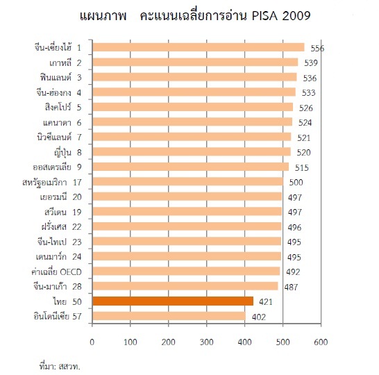 จากกราฟจะเห็นได้ว่าตั้งแต่ปี ค.ศ.2000 เป็นต้นมา เด็กไทยทำคะแนน PISA ได้น้อยลงมาเป็นลำดับ ขณะที่ปี ค.ศ.2009 กราฟเริ่มจะปรับทิศหันขึ้นเล็กน้อย โดยวิทยาศาสตร์ อยู่ที่ 425 คณิตศาสตร์ อยู่ที่ 419 และการอ่าน อยู่ที่ 421