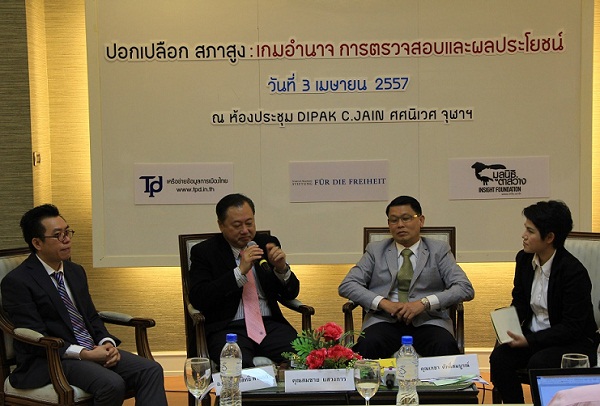 จากนั้นมีการเสวนา หัวข้อ “ปอกเปลือกสภาสูง: เกมอำนาจ การตรวจสอบและผลประโยชน์” ประกอบด้วย นายเกชา ศักดิ์สมบูรณ์ อดีตส.ว.ราชบุรี นายสมชาย แสวงการ ส.ว.สรรหา และนายอรรถสิทธิ์