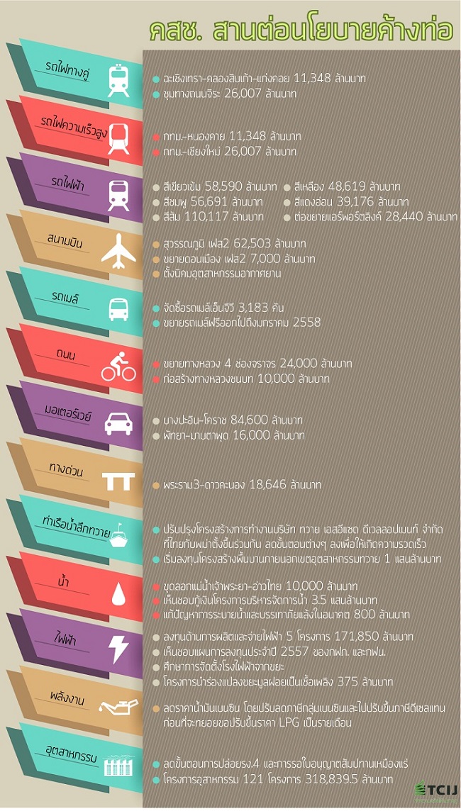 ก่อนหน้านี้ในรัฐบาลยิ่งลักษณ์ ชินวัตร มีการประกาศนโยบายเดินหน้าพัฒนาโครงสร้างพื้นฐานจำนวนมาก โดยเฉพาะในส่วนของกระทรวงคมนาคม ที่จะมีการสร้างโครงข่ายระบบคมนาคมเพิ่มขึ้นทั้ง การปรับปรุงท่าอากาศยานต่างๆ การสร้างรถไฟความเร็วสูง รถไฟรางคู่ ถนนระหว่างเมือง ท่าเรือน้ำลึก ถึงขนาดเดินสายให้ข้อมูลกับประชาชนทุกภูมิภาค รวมไปถึงโครงการบริหารจัดการน้ำ และการพัฒนาอุตสาหกรรมต่าง ๆ