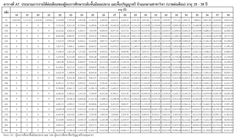 สาขาวิทยาศาสตร์สุขภาพเป็นสาขาที่ให้ผลตอบแทนตลอดช่วงชีวิตมากที่สุด โดยเริ่มต้นที่ค่าเฉลี่ยเท่ากับ 14,609.28 บาทต่อเดือน และมีอัตราเติบโตสูงขึ้นตามลำดับจนกระทั่งสูงสุดที่อายุ 59 ปี ที่ค่าเฉลี่ย 32,268. 92 บาทต่อเดือน ซึ่งพบว่าปัจจัยการเสื่อมถอยของประสบการณ์มีอิทธิพลค่อนข้างน้อยต่อรายได้ ขณะที่สาขาทางด้านการคุ้มครองสิ่งแวดล้อม เป็นสาขาระดับปริญญาตรีที่มีรายได้เริ่มต้นต่ำที่สุด โดยมีรายได้รวมเฉลี่ยที่ 5,005.53 บาทต่อเดือน อย่างไรก็ตาม รายได้ของผู้จบการศึกษาสาขานี้มีอัตราการเติบโตอย่างรวดเร็ว โดยมีรายได้สูงสุดอยู่ที่อายุ 44 ปี ที่รายได้ 41,364.26 บาทต่อเดือน และลดลงอย่างรวดเร็วเช่นกัน จนถึงอายุ 60 ปี มีรายได้ที่ 15,103.11 บาทต่อเดือนโดยทั่วไปรายได้เริ่มต้นของผู้จบปริญญาตรีแต่ละสาขา มีรายได้อยู่ในระดับใกล้เคียงกัน คือมีรายได้อยู่ระหว่าง 6,000 – 9,000 บาทต่อเดือน และพบว่าได้รับอิทธิพลจากการเสื่อมถอยจากปัจจัยประสบการณ์เพียงเล็กน้อย
