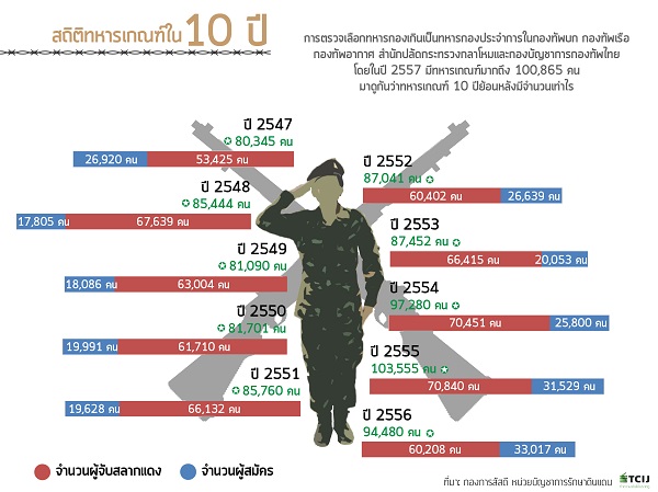 จำนวนความต้องการทหารเกณฑ์ในปี 2557 สูงถึง 100,865 นาย เพิ่มขึ้นจากปีที่แล้ว 6,385 นาย และเช่นเดียวกับทุกปี สื่อและสังคมมักจับจ้องไปที่ดาราหรือลูกคนดังว่า ปีนี้ใครจะต้องเข้าตรวจเลือกเป็นทหารกองประจำการหรือที่เรียกกันทั่วไปว่า “ทหารเกณฑ์”