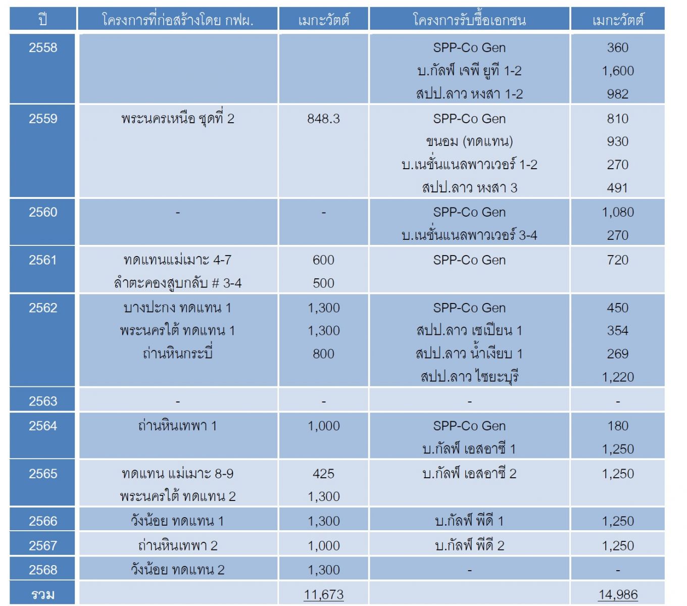 ทั้งนี้พบว่าโครงการที่มีภาระผูกพันและเพื่อความมั่นคงของระบบ (รวมทั้งการรับซื้อจากต่างประเทศ) ระหว่างปี พ.ศ. 2558-2568 นั้นเบื้องต้นมี 26,754 เมกะวัตต์ ส่วนโครงการโรงไฟฟ้าใหม่ (รวมทั้งการรับซื้อจากต่างประเทศ) ระหว่างปี พ.ศ. 2569-2579 มีจำนวน 30,713 เมกะวัตต์ ซึ่งรวมกันแล้วจะมีกำลังผลิต 57,467 เมกะวัตต์
