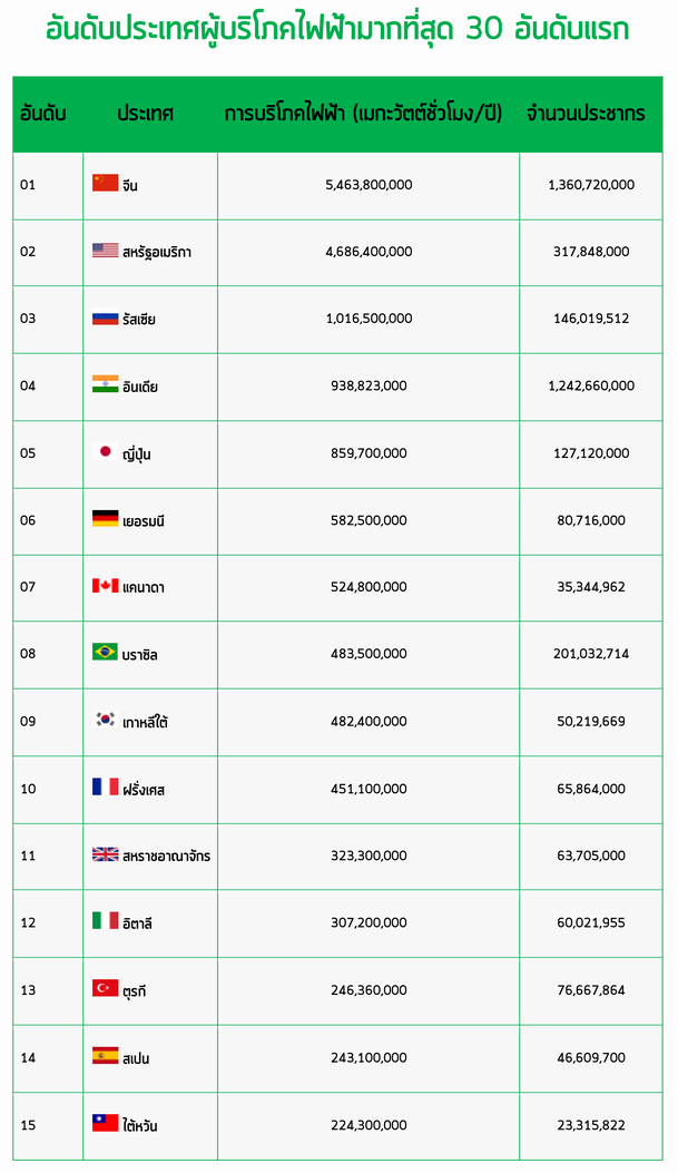 โดยประเทศที่มีประชากรน้อยกว่ าประเทศไทยแต่บริโภคไฟฟ้ามากกว่ าไทยนั้นมีได้แก่ อันดับที่ 21 ยูเครน บริโภคไฟฟ้า 175,300,000 เมกะวัตต์ชั่วโมง/ปี อันดับที่ 19 ออสเตรเลีย 222,600,000 เมกะวัตต์ชั่วโมง/ปี อันดับที่ 18 ซาอุดิอาระเบีย 231,600,000 เมกะวัตต์ชั่วโมง/ปี อันดับที่ 16 แอฟริกาใต้ 234,200,000 เมกะวัตต์ชั่วโมง/ปี อันดับที่ 15 ไต้หวัน 224,300,000 เมกะวัตต์ชั่วโมง/ปี อันดับที่ 14 สเปน 243,100,000 เมกะวัตต์ชั่วโมง/ปี อันดับที่ 12 อิตาลี 307,200,000 เมกะวัตต์ชั่วโมง/ปี อันดับที่ 11 สหราชอาณาจักร 323,300,000 เมกะวัตต์ ชั่วโมง/ปี อันดับที่ 10 ฝรั่งเศส 451,100,000 เมกะวัตต์ชั่วโมง/ปี อันดับที่ 9 เกาหลีใต้ 482,400,000 เมกะวัตต์ชั่วโมง/ปี และอันดับ 7 แคนาดา 524,800,000 เมกะวัตต์ชั่วโมง/ปี
