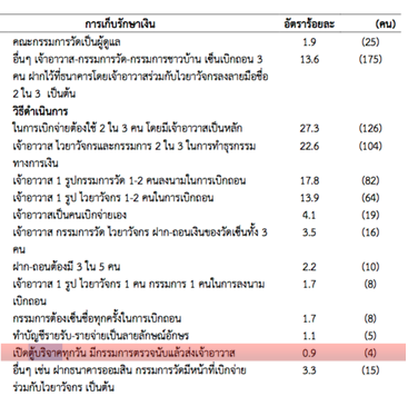 มีเพียง 4 คน หรือร้อยละ 0.9 ของกลุ่มตัวอย่างคณะกรรมการบริหารวัดจำนวนเท่านั้นที่ระบุว่าเปิดตู้บริจาคเงินวัดทุกวัน มีกรรมการตรวจนับแล้วส่งเจ้าอาวาส (ณดา จันทร์สม, 2555, หน้า 77)