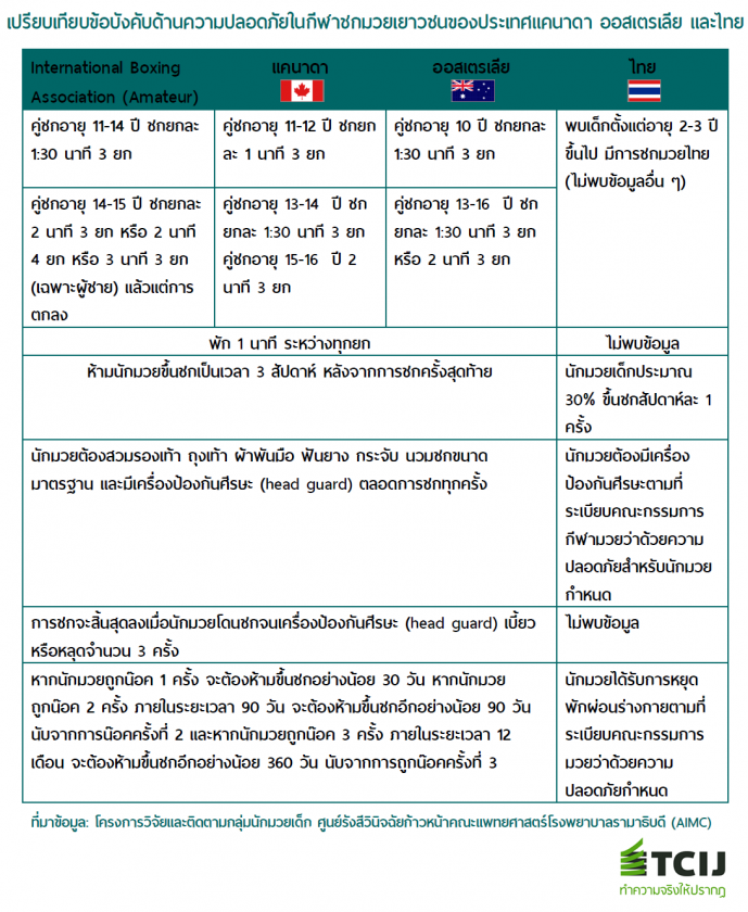 ข้อมูลที่รวบรวมโดยโครงการวิจัยและติดตามกลุ่มนักมวยเด็ก ศูนย์รังสีวินิจฉัยก้าวหน้าคณะแพทยศาสตร์โรงพยาบาลรามาธิบดี (AIMC) ได้เปรียบเทียบกฎระเบียบข้อบังคับด้านความปลอดภัยกีฬาชกมวยเยาวชนของประเทศแคนาดา ออสเตรเลีย และไทยไว้ดังนี้