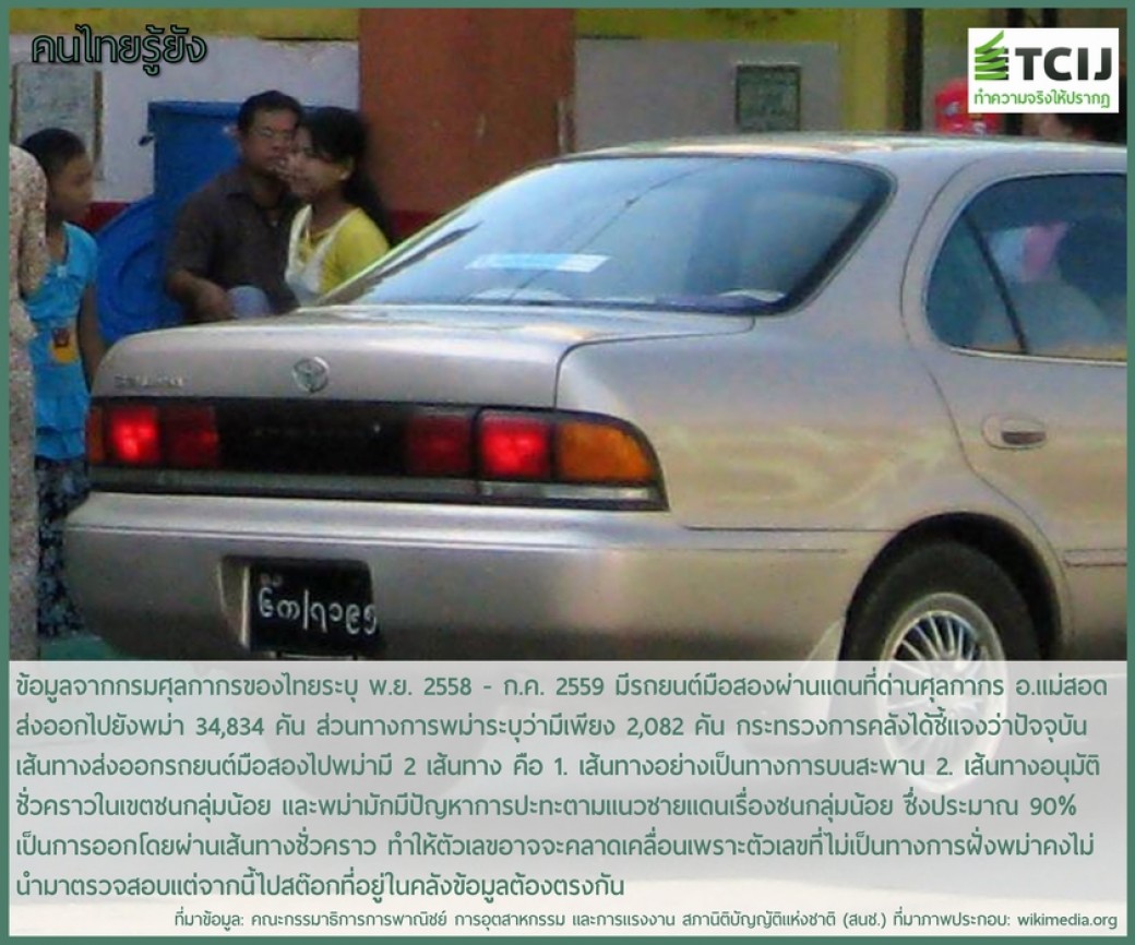 ข้อมูลจากคณะกรรมาธิการการพาณิชย์ การอุตสาหกรรม และการแรงงาน สภานิติบัญญัติแห่งชาติ (สนช.) ระบุว่าจากการลงพื้นที่ติดตามตรวจสอบการขนส่งรถยนต์มือสองผ่านแดนอย่างต่อเนื่องจากที่มีการร้องเรียน ทำให้พบปัญหารถยนต์ตกค้างอยู่ในเขตประเทศไทยจำนวนมาก โดยมีการนำมาจอดพักตามแนวชายแดน อ.แม่สอด จ.ตาก ทั้งที่ต้องนำผ่านแดนไปยังประเทศเพื่อนบ้านโดยเร็ว ทำให้เกิดข้อสงสัยว่าผู้ประกอบการมีการปฏิบัติทางศุลกากรที่ไม่ถูกต้องตามกฎหมายหรือไม่ โดยเฉพาะการหลีกเลี่ยงไม่ต้องเสียภาษี และมีการทำเป็นกระบวนการค้ารถผิดกฎหมาย หรือลักลอบซื้อขายประมูล สวมสิทธิ หรือนำอะไหล่ออกมาขาย ซึ่งกรณีนี้ส่งผลกระทบต่อเศรษฐกิจประเทศ และผู้ประกอบการนำเข้ารถยนต์มือสองมาปรับสภาพที่ทำถูกต้องตามกฎหมาย โดยจากข้อมูลผ่านแดนรถยนต์มือสองไปยังประเทศพม่าเดือนพฤศจิกายนปี 2558-กรกฎาคม ปี 2559 รวม 9 เดือน พบข้อมูลไม่ตรงกันระหว่างไทยกับพม่า โดยกรมศุลกากรระบุว่าได้ให้รถยนต์มือสองผ่านแดนส่งออกไปยังพม่า 34,834 คัน แต่เมื่อคณะกรรมาธิการฯ สอบถามไปยังประเทศพม่ากลับได้รับแจ้งว่ามีรถยนต์มือสองผ่านแดนที่ด่านศุลกากร อ.แม่สอด เพียง 2,082 คัน