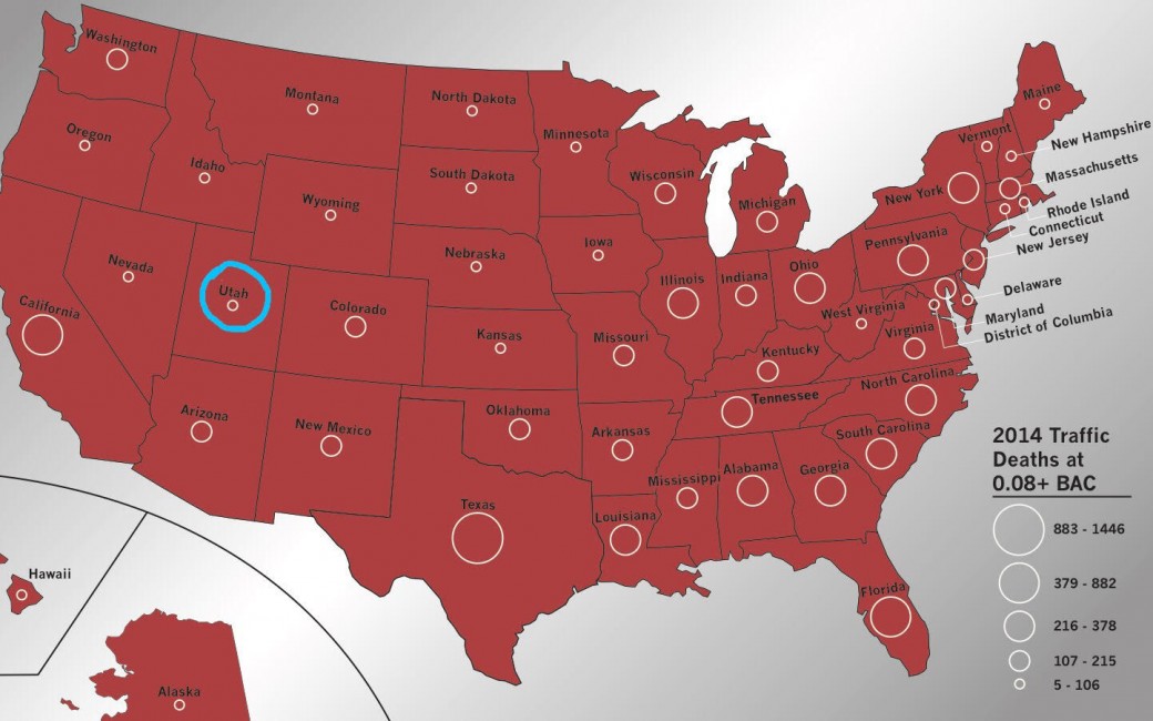 ส่วนที่สหรัฐฯ จากการแบ่งกลุ่มมลรัฐที่ประชาชนเสียชีวิตทางถนนเนื่องจากระดับแอลกอฮอล์ในเลือด (BAC) ตั้งแต่ 0.08 ขึ้นไป ในปี 2014 ยูทาห์ก็ติด 1 ใน 20 ของกลุ่มที่ตายน้อยที่สุด คือระหว่าง 5-106 คน