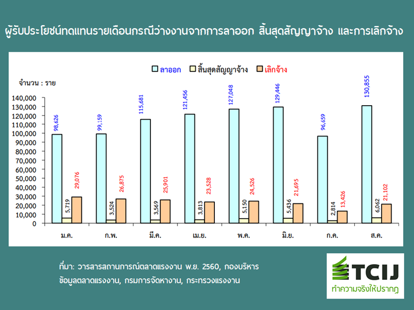 ข้อมูลจาก กองบริหารข้อมูลตลาดแรงงาน กรมการจัดหางาน กระทรวงแรงงาน ระบุว่าจากสถิติผู้รับประโยชน์ทดแทนกรณีว่างงานระหว่างเดือน ม.ค.-ส.ค. 2560 พบว่ามีผู้ประกันตนตามมาตรา 33 ลาออกเดือนละ 96,659-130,855 คน/เดือน โดยในเดือน ม.ค. มีผู้ลาออกจากงาน 98,626 คน, ก.พ. 99,159 คน, มี.ค. 115,681 คน, เม.ย. 121,456 คน, พ.ค. 127,048 คน, มิ.ย. 129,446 คน, ก.ค. 96,659 คน และ เดือน ส.ค. มีผู้ลาออกจากงาน 130,855 คน เมื่อพิจารณาจากเดือน ส.ค. 2560 พบว่าจากผู้รับประโยชน์ทดแทนกรณีว่างงาน 158,019 คน มีผู้รับผลประโยชน์ทดแทนกรณีว่างงานโดยการลาออกจำนวน 130,855 คน (ร้อยละ 82.8) กรณีว่างงานโดยสิ้นสุดสัญญาจ้างจำนวน 6,062 คน (ร้อยละ 3.83) และกรณีว่างงานโดยการเลิกจ้าง จำนวน 21,102 คน (ร้อยละ 13.35) ซึ่งหากใช้ฐานข้อมูลนี้คำนวณออกมาเป็นสัดส่วน พบว่าผู้ว่างงาน 8 ใน 10 คน จะเป็นผู้ที่ลาออกจากงานที่เคยทำมา