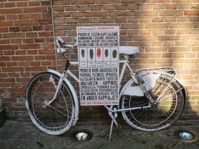 ท่ามกลางบรรยากาศการประท้วงอย่างเสรีต่อต้านการเติบโตของลัทธิทุนนิยม ขบวนการ Provo มีบทบาทโดดเด่นในการต่อต้านจำนวนรถยนต์ที่มากขึ้นในอัมสเตอร์ดัม และได้เสนอแนวคิด “โครงการจักรยานสีขาว” (Witte Fiets Plan ในภาษาดัตช์) โดยบริจาคจักรยานทาสีขาวจำนวนหนึ่งให้เป็นจักรยานมวลชนนำไปจอดตามจุดต่างๆ เพื่อให้คนใช้ฟรีและเมื่อใช้เสร็จแล้วให้จอดไว้โดยที่ไม่ต้องล็อกเพื่อให้คนอื่นนำไปใช่ต่อได้ แต่รัฐบาลกลับไม่เห็นด้วยและได้ยึดจักรยานตามโครงการดังกล่าวนี้ไป เพราะเห็นว่าเป็นการยั่วยุให้เกิดการขโมยจักรยาน ซึ่งเป็นอาชญากรรมประเภทหนึ่งที่เจ้าหน้าที่ตำรวจต้องการปราบปราม การรณรงค์และการประท้วงดักล่าวกลายเป็นการเผชิญหน้าของขบวนการ Provo และผู้ชุมนุมที่ให้การสนับสนุนอยู่หลายที่และหลายครั้ง โดยเฉพาะอย่างยิ่งบริเวณหน้ารูปปั้นเด็กผู้ชายยืนเท้าสะเอว Lieverdje หรือ “Little dear” สัญลักษณ์ของเยาวชน ที่บริเวณจตุรัสสเปา (Spui Square) หนึ่งในข้อเสนอของขบวนการ Provo คือให้เทศบาลเมืองอัมสเตอร์ดัมพิจารณาปิดถนนบริเวณใจกลางเมืองไม่ให้รถยนต์เข้าออก และขอให้ทางเทศบาลซื้อจักรยานสีขาวตามโครงการ 20,000 คันให้ขี่ในเขตเมือง แต่สุดท้ายข้อเสนอก็ไม่สามารถบรรลุข้อตกลงระหว่างรัฐบาลและผู้นำขบวนการได้