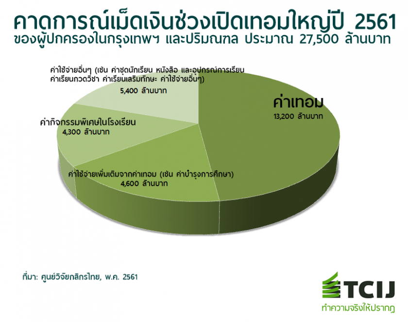 นอกจากนี้ศูนย์วิจัยกสิกรไทยได้คาดการณ์ว่าในช่วงเปิดเทอมใหญ่ปี 2561 ผู้ปกครองในกรุงเทพฯ และปริมณฑล ใช้จ่ายด้านการศึกษาสำหรับบุตรหลานคิดเป็นเม็ดเงินสะพัด 27,500 ล้านบาท ขยายตัวร้อยละ 1.9 เมื่อเทียบกับในช่วงเปิดเทอมใหญ่ปี 2560 ในจำนวนนี้แบ่งเป็นค่าเทอม 13,200 ล้านบาท ค่าใช้จ่ายเพิ่มเติมจากค่าเทอม (เช่น ค่าบำรุงการศึกษา) 4,600 ล้านบาท ค่ากิจกรรมพิเศษในโรงเรียน 4,300 ล้านบาท และค่าใช้จ่ายอื่นๆ (เช่น ค่าชุดนักเรียน หนังสือ และอุปกรณ์การเรียน ค่าเรียนกวดวิชา ค่าเรียนเสริมทักษะ ค่าใช้จ่ายอื่นๆ) รวมกัน 5,400 ล้านบาท