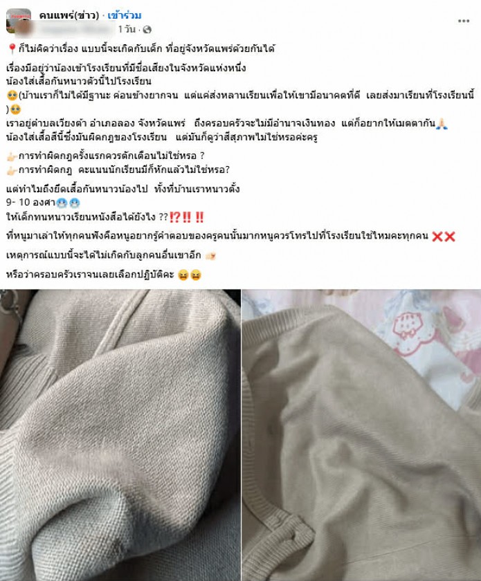 จากเหตุการณ์ที่มีครูในจังหวัดแพร่ได้ยึดเสื้อกันหนาวของนักเรียนเพียงเพราะเสื้อกันหนาวนั้น ไม่ตรงตามระเบียบเครื่องแบบที่โรงเรียนกำหนดทั้งที่อุณหภูมิ 10 องศาเซลเซียส เป็นสิ่งที่ต้องสะท้อนให้เห็นว่านี่คือเหตุการณ์ที่มากกว่าแค่ปัญหาวินัยในโรงเรียน แต่เป็นภาพจำลองของโครงสร้างอำนาจที่ฝังลึกในระบบการศึกษาไทย ที่ควบคุมร่างกายนักเรียน โดยใช้กฎ ระเบียบ และการบังคับเชิงสถาบัน จนกลายเป็นเรื่องปกติ