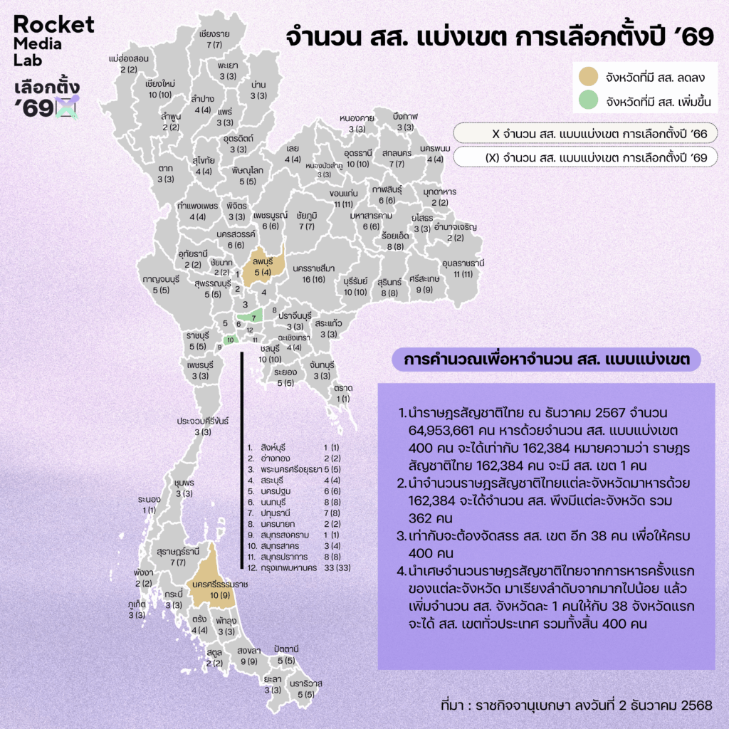 Rocket Media Lab คำนวณเพื่อหาจำนวน สส. แบบแบ่งเขต โดยอิงจำนวนราษฎรสัญชาติไทยทั่วราชอาณาจักร ณ วันที่ 31 ธันวาคม 2567 จำนวน 64,953,661 คน คิดเป็นจำนวนราษฎรโดยเฉลี่ย 162,384 คน ต่อ สส. 1 คน พบนครศรีธรรมราช ลพบุรี สส. ลด ปทุมธานี สมุทรสาคร สส. เพิ่ม