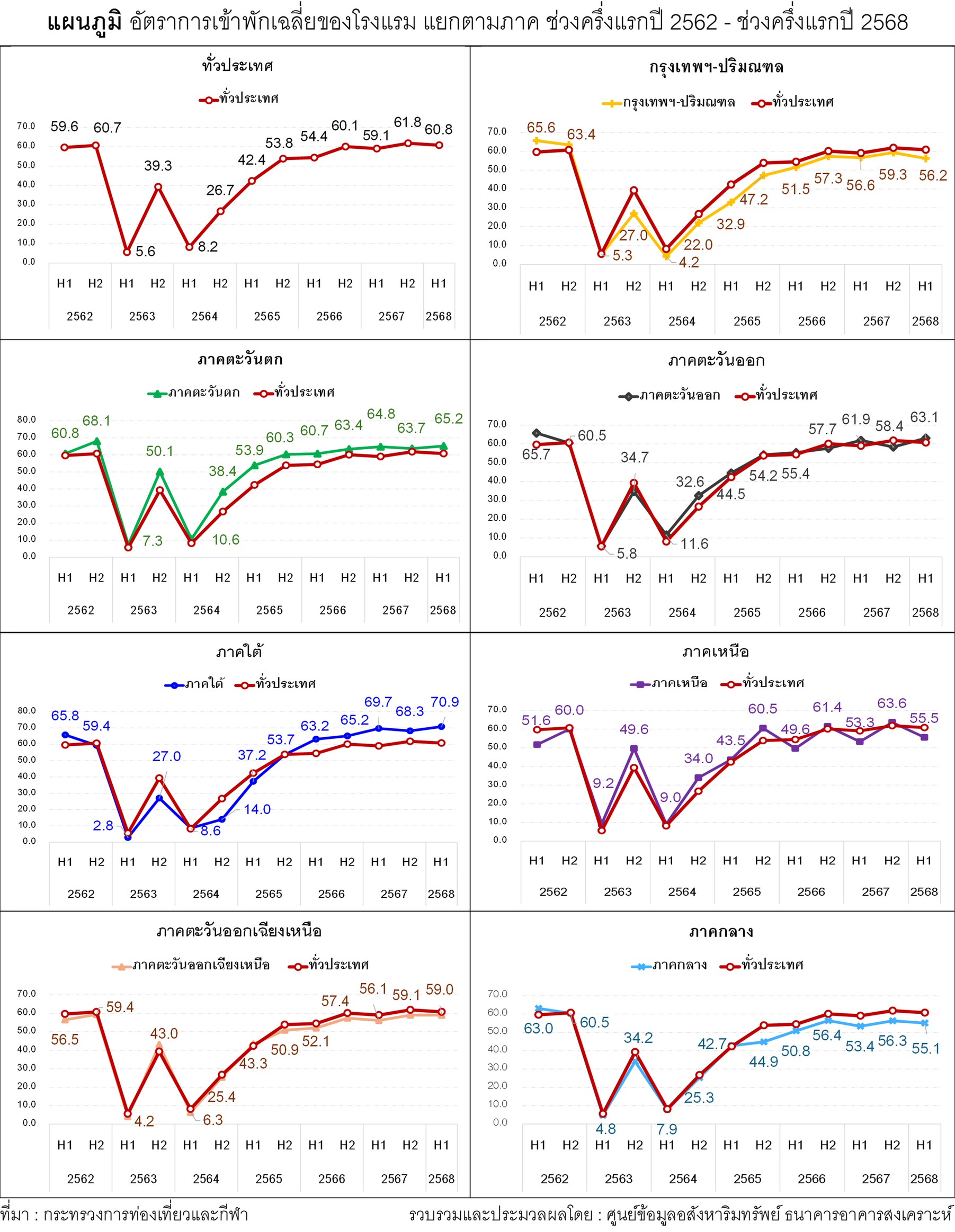 สำหรับอัตราการเข้าพักเฉลี่ยของโรงแรม ณ ครึ่งแรกปี 2568 อัตราการเข้าพักเฉลี่ยของโรงแรมทั่วประเทศอยู่ที่ร้อยละ 60.8 เพิ่มขึ้นเมื่อเทียบกับช่วงเดียวกันของปีก่อน (YoY) ที่มีอัตราการเข้าพักเฉลี่ยอยู่ที่ร้อยละ 59.1 เมื่อแบ่งเป็นรายภาค พบว่า ภาคใต้มีอัตราการเข้าพักเฉลี่ยมากที่สุดร้อยละ 70.9 รองลงมา ได้แก่ ภาคตะวันตกร้อยละ 65.2 ภาคตะวันออกร้อยละ 63.1 ภาคตะวันออกเฉียงเหนือร้อยละ 59.0 กรุงเทพฯ - ปริมณฑล ร้อยละ 56.2 ภาคเหนือร้อยละ 55.5 และภาคกลางร้อยละ 55.1 ตามลำดับ ซึ่งเกือบทุกภาคมีอัตราการเข้าพักเฉลี่ยเพิ่มขึ้น อย่างไรก็ตาม มีเพียงกรุงเทพฯ - ปริมณฑลที่มีอัตราการเข้าพักเฉลี่ยลดลงร้อยละ -0.7 สะท้อนว่า อุปสงค์หรือจำนวนผู้เข้าพัก ลดลงสวนทางกับจำนวนห้องพักสะสมที่เพิ่มขึ้นในกรุงเทพฯ-ปริมณฑล ส่งผลให้การแข่งขันในตลาดที่พักของกรุงเทพฯ และปริมณฑลสูงขึ้น และเป็นความท้าทายที่ผู้ประกอบการต้องวางแผนและปรับกลยุทธ์เพื่อรับมือกับความเสี่ยงจากภาวะอุปทานส่วนเกิน