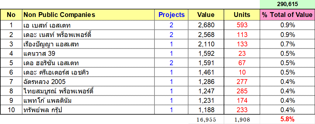 เมื่อพิจารณาถึงบริษัทนอกตลาดหลักทรัพย์ที่มีขนาดใหญ่ที่สุดจะพบว่า บจก.เอ เบสท์ เอสเตท มีการพัฒนา 2 โครงการ รวม 2,680 ล้านบาท จำนวน 593 หน่วย อันดับสองคือ บจก.นอร์ธแลนด์ ดีเวลล็อปเม้นท์ พัฒนา 558 หน่วย และอันดับสาม บจก.วิถีไทย เรียลเอสเตท พัฒนาถึง 5 โครงการ จำนน 495 หน่วย และหากพิจารณาอันดับสองในแง่มูลค่าก็เป็น บจก.เดอะ เนสท์ พร็อพเพอร์ตี้ มูลค่า 2,568 ล้านบาท และอันดับสามในแง่มูลค่าคือ บจก.เรืองปัญญา แอสเสท มูลค่า 2,110 ล้านบาท