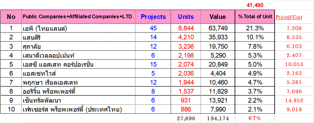 ทั้งนี้อันดับสองของจำนวนหน่วยมากสุดก็คือ บมจ.แสนสิริ พัฒนา 14 โครงการ รวม 4,210 หน่วย มูลค่า 35,933 ล้านบาท เฉลี่ยหน่วยละ 8.535 ล้านบาท มีส่วนแบ่งในตลาด 10.1% และอันดับที่ 3 คือ บมจ.ศุภาลัย พัฒนา 12 โครงการ รวม 3,236 หน่วย รวมมูลค่า 19,750 ล้านบาท หรือเฉลี่ยหน่วยละ 6.103 ล้านบาท มีส่วนแบ่งในตลาด 7.8%