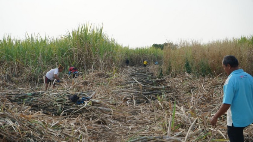 อำเภอคลองหาด จังหวัดสระแก้ว – กลางแดดยามบ่ายในกลางเดือนมกราคม ท่ามกลางไร่อ้อยทอดไกลสุดระยะสายตา คนงาน 6 คนกำลังง่วนอยู่กับการตัดถางต้นอ้อย ให้ค่อยๆ แหว่งลึกเข้าไป
