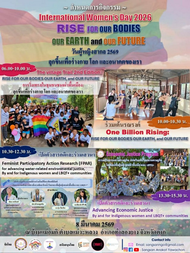 The Sangsan Anakot Yawachon Foundation, together with a team of LBQT+ Indigenous women trail runners and walkers/ Chiang Mai Frontrunners, and V-Day Thailand, in collaboration with Indigenous women youth leaders from Mae Omki Village, the Mae Wa Luang Subdistrict Administrative Organization, Ban Mae Omki School, and the Mae Wa Luang Subdistrict Health Promoting Hospital. With support from Foundation for a Just Society, Partners Asia, and V-Day, we organized the ‘International Women’s Day 2026: Rise for Our Bodies, Our Earth, and Our Future’ more than a celebration, the event established a safe, collective space for Indigenous women, children, and LBQT+ to empower and claim our essential roles in shaping our own bodies, our futures, our communities, and the world we inhabit.