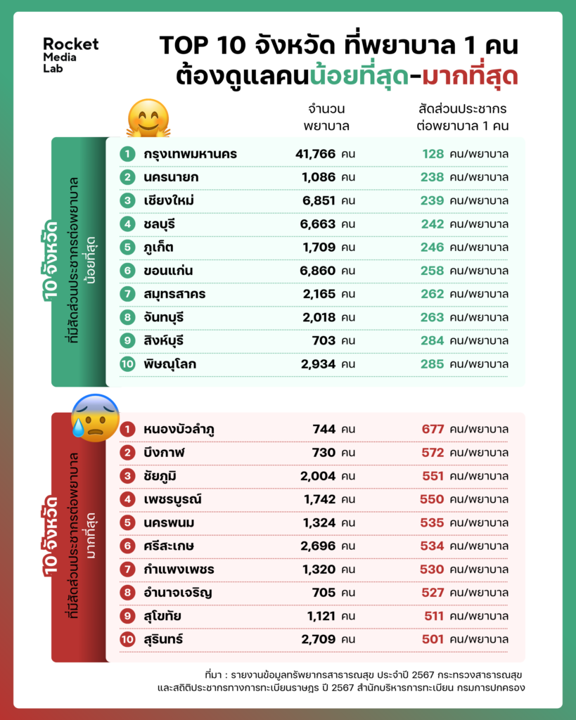 ในขณะที่จังหวัดที่ใช้พยาบาล 1 คนดูแลประชากรมากที่สุด คือ หนองบัวลำภู สัดส่วนประชากร 677 คน ต่อพยาบาล 1 คน ตามมาด้วย บึงกาฬ สัดส่วนประชากร 572 คน ต่อพยาบาล 1 คน ชัยภูมิ สัดส่วนประชากร 551 คน ต่อพยาบาล 1 คน เพชรบูรณ์ สัดส่วนประชากร 550 คน ต่อพยาบาล 1 คน และนครพนม สัดส่วนประชากร 535 คน ต่อพยาบาล 1 คน
